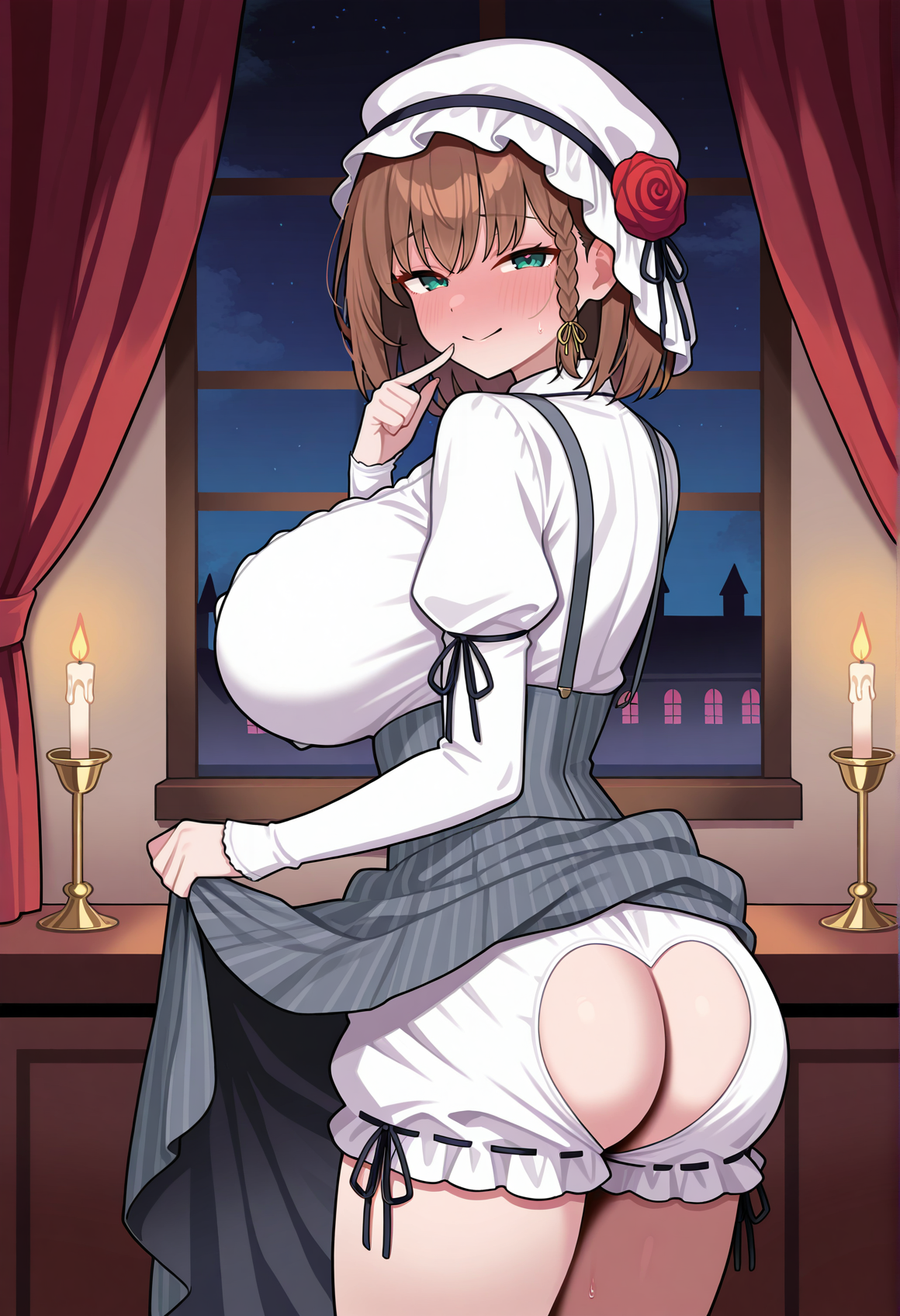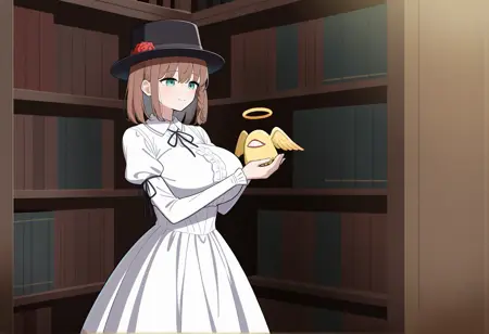 주요 태그: 단발, 갈색 머리, 땋은 머리, 녹색 눈, 모자, 흰색 셔츠, 긴 소매, 리본, 빨간 꽃, 검은 꽃, 흰색 치마
