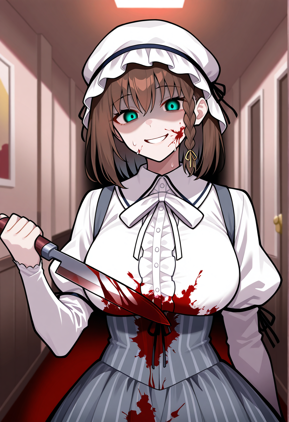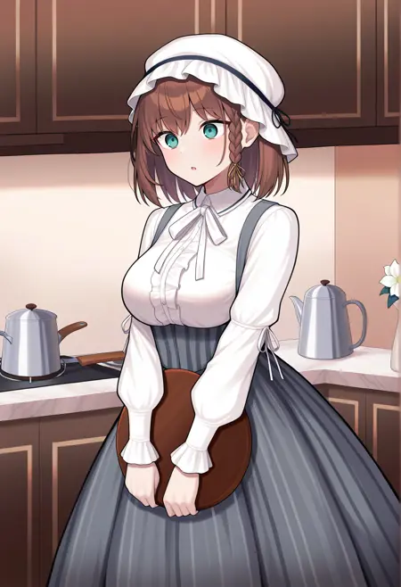 계승 2: 단발, 갈색 머리, 땋은 머리, 녹색 눈, 보넷, 흰색 셔츠, 긴 소매, 리본, 흰색 꽃, 회색 치마, 코르셋, 스스펜더, 세로 줄무늬 옷, 흰색 리본