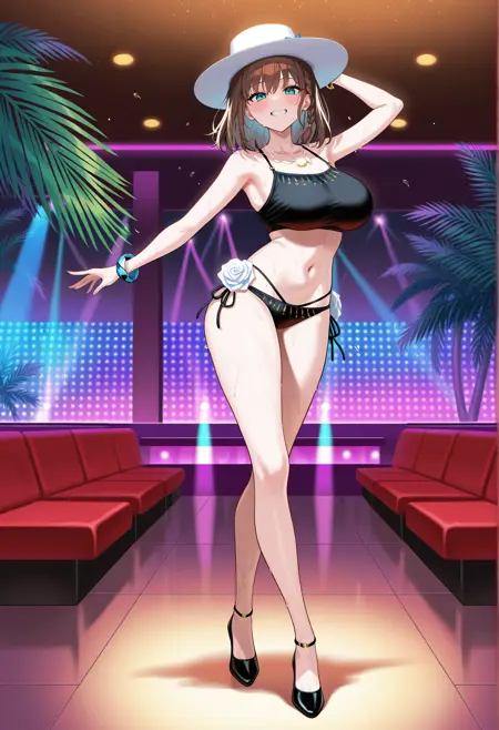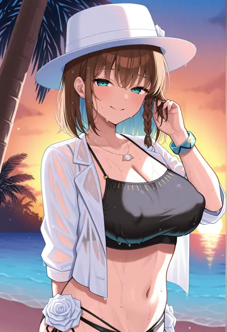 수영복 1: 단발, 갈색 머리, 땋은 머리, 녹색 눈, 흰색 모자, 목걸이, 팔찌, 검은 비키니, 흰색 장미, 파란색 사이드 티 바지, 재킷