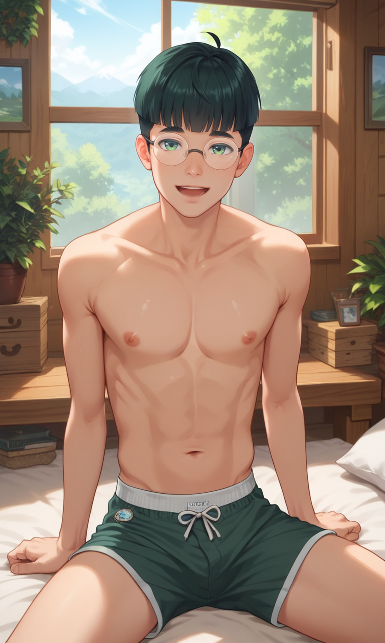 glasses, brown-grey shirt, black belt, green shorts, green stripped necktie, star on neckerchief, short sleeves