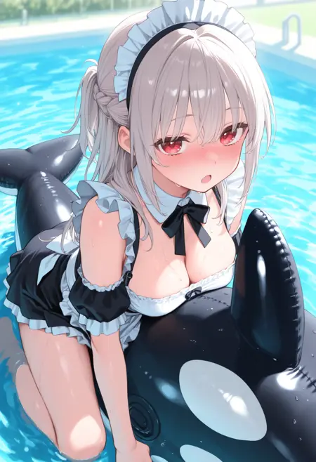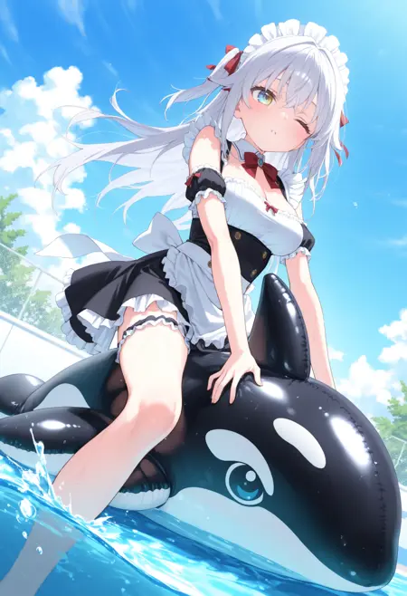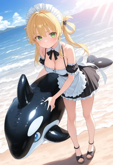 최근 해변이나 수영장에서 자주 볼 수 있는 저렴하면서도 엄청나게 큰 고래형 플로트 위에 타는 LoRA입니다. Illustrious 계열은 이미 학습되어 있지만, 특징적인 눈을 포함한 형상이 안정화됩니다.