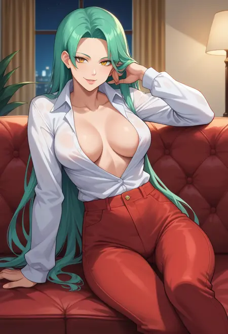 "DRKSTKRSMORAENS, 노랑 눈, 연한 녹색 머리카락, 긴 머리, 갈라진 머리, 흰색 칼라 셔츠, 벌어진 셔츠, 빨간 가죽 바지"
