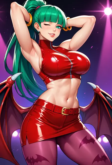 "DRKSTKRSMORAENS, 녹색 머리카락, 둔한 앞머리, 높은 포니테일, 빨간 크롭 탑, 소매 없음, 팔찌, 빨간 연필 치마, 팬티스타킹, 박쥐 무늬"