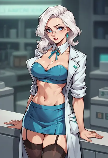 - For basic clothes you can use: detached collar, lab coat, stockings, garter straps, crop top, cleavage, mini skirt