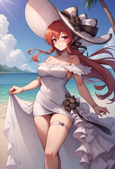 MonarchWhiteWarrick, 长发, 白色太阳帽, 白色连衣裙, 露肩裙, 透视胸线, 短裙, 前短后长裙摆, 花边, 白色大腿绑带