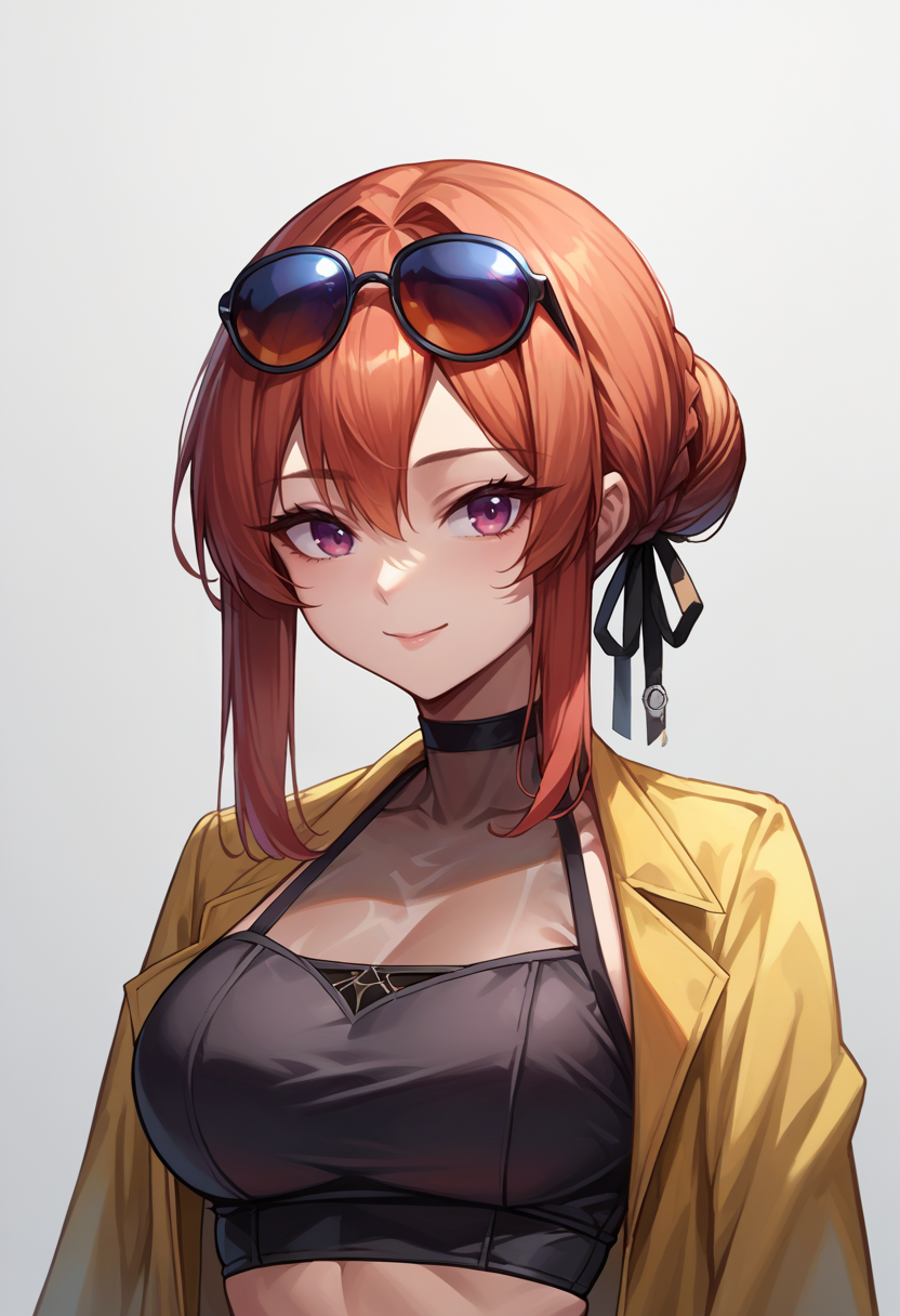 MonarchDetective, 长发, 直发, 墨镜戴在头上, 有领衬衫, 白色衬衫, 长袖, 胸部绑带, O型环, 黑色领带, 黑色裙子, 紧身裙, 黑色连裤袜, 黑色大衣, 大衣搭在肩上, 黑色高跟鞋