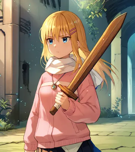 <lora:Lucy:0.9>, Lucy, 금발, 긴 머리, 파란 눈, 머리핀, 작은 가슴, 분홍색 후드티, 펜던트, 흰색 스카프, 주름치마, 흰 양말, 갈색 신발,
