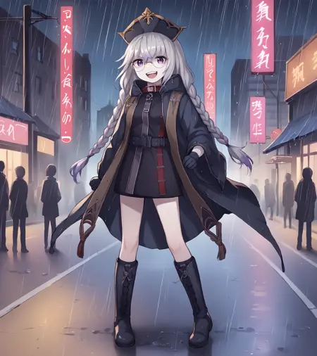 <lora:Charon:0.9>, Charon, 회색 머리, 긴 머리, 두 줄 땋은 머리, 보라색 눈, 창백한 피부, 작은 가슴, 안경, 검은 모자, 코트, 검은 드레스, 검은 장갑, 검은 부츠,
