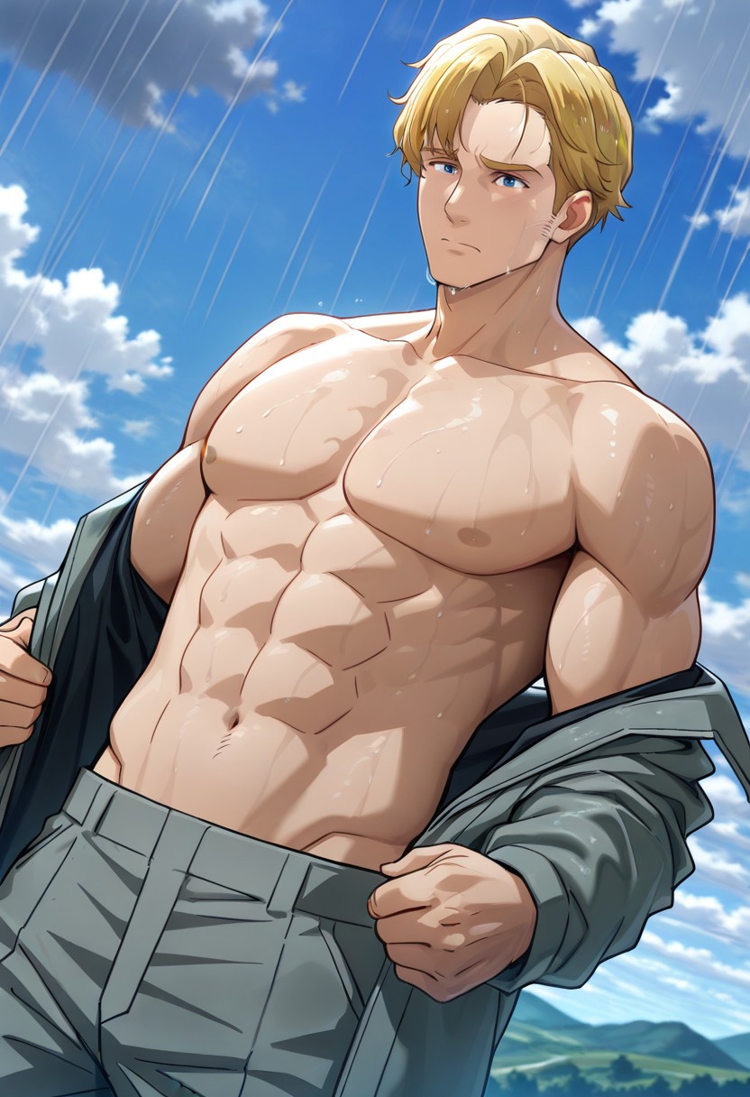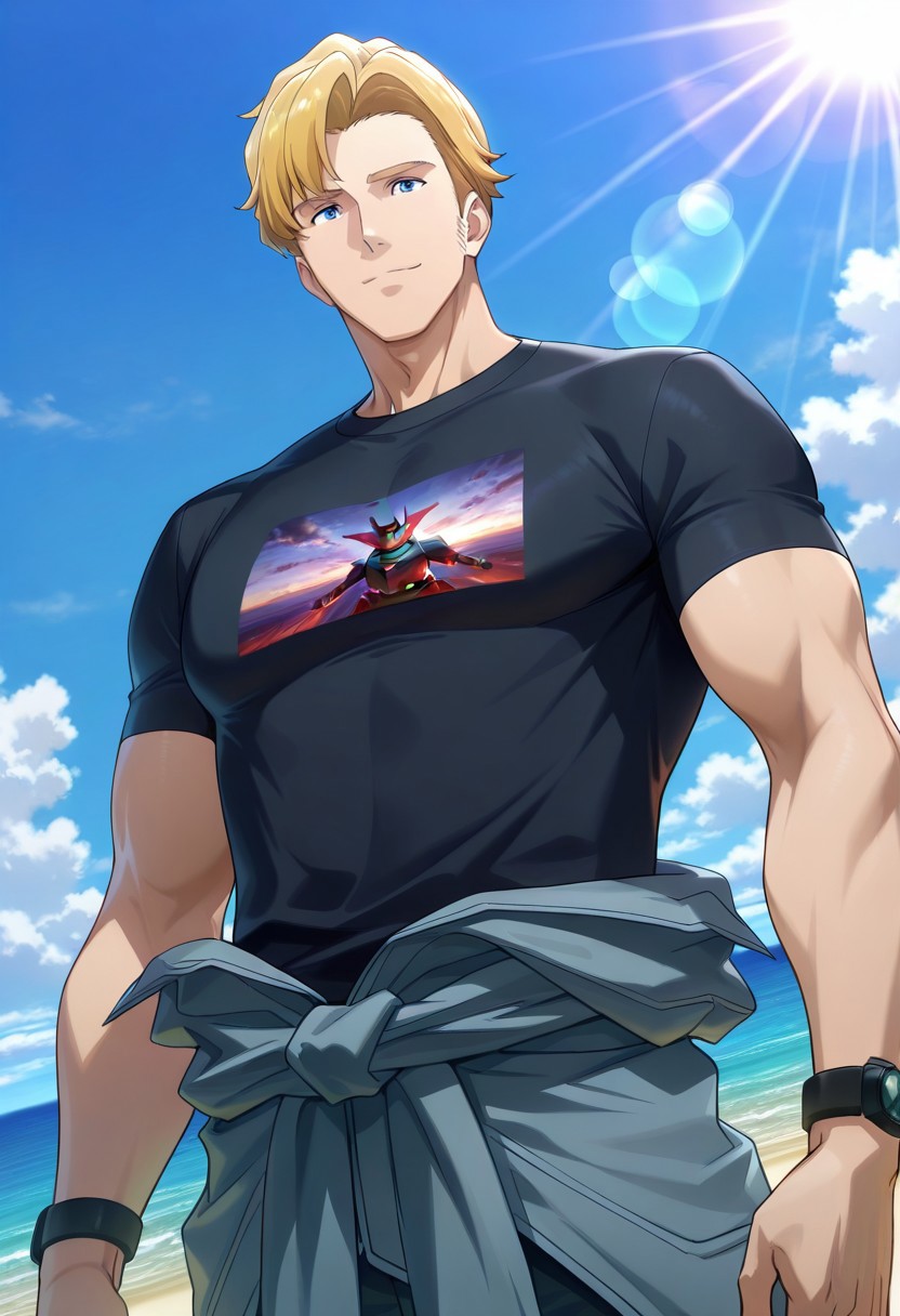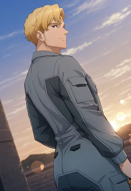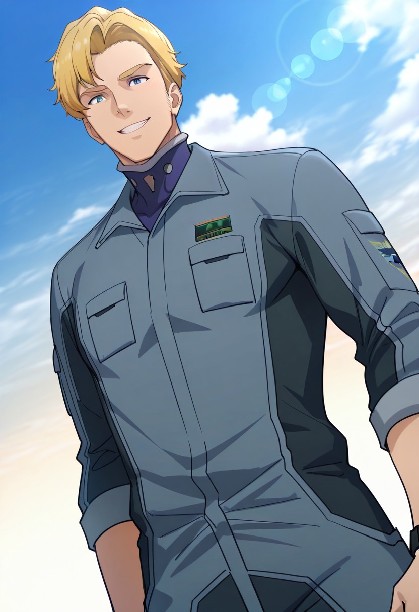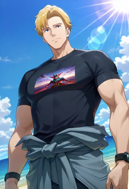 アニメキャラクターsuperherogaybaramechaamericanmuscularhandsomehomoerotichomosexuallgbtqia+muscular maleshirtmasculineyaoianime characteryoung manmalemanshort hairuniformblue eyessoldierjumpsuitheropilotformal wearblondpilot suithunkgay manmale charactermuscular manhawaiian shirtathletic bodybrave bang bravern