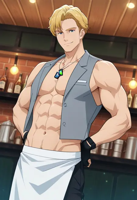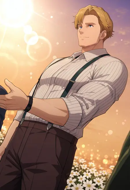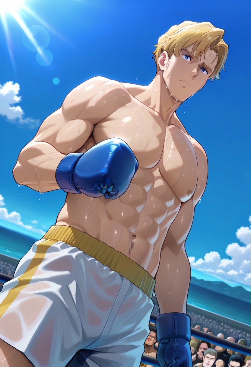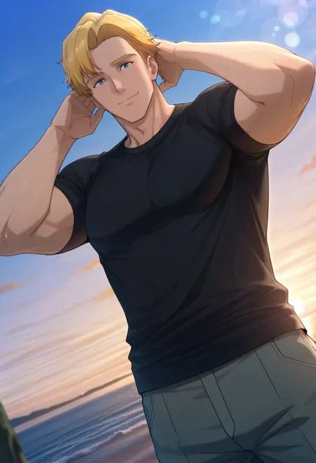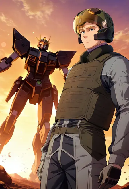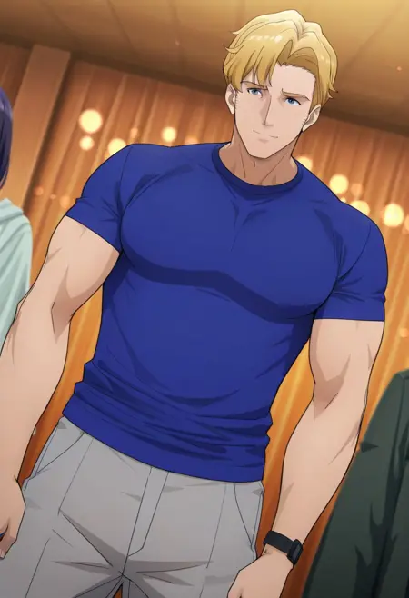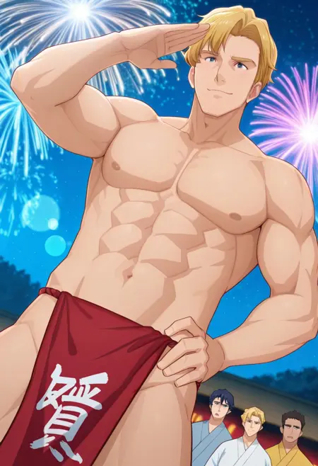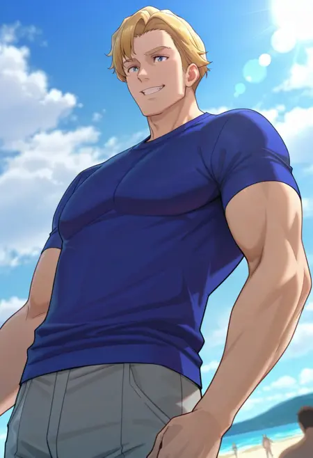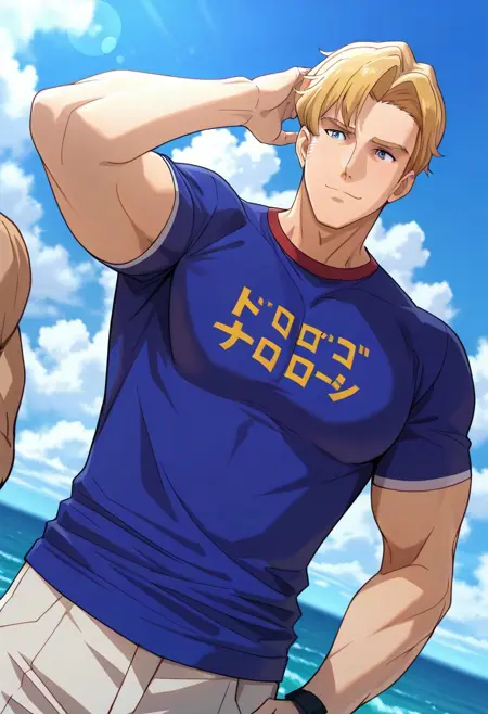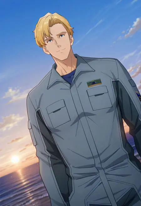 アニメキャラクターsuperherogaybaramechaamericanmuscularhandsomehomoerotichomosexuallgbtqia+muscular maleshirtmasculineyaoianime characteryoung manmalemanshort hairuniformblue eyessoldierjumpsuitheropilotformal wearblondpilot suithunkgay manmale charactermuscular manhawaiian shirtathletic bodybrave bang bravern