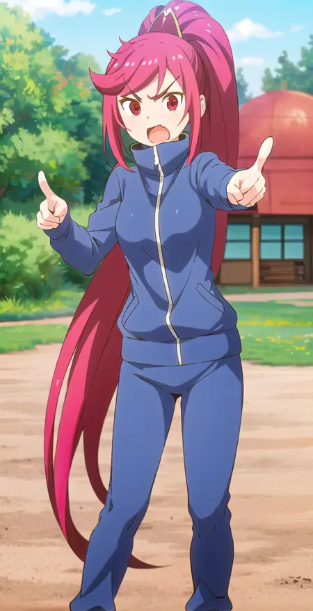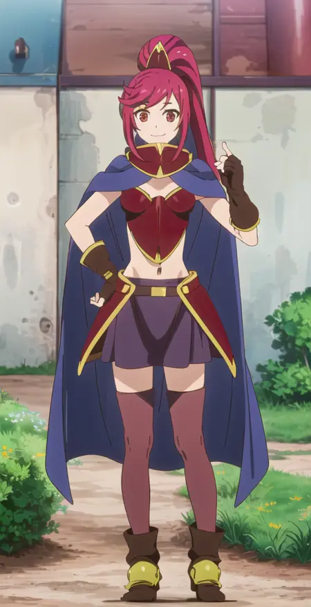 主要服装-'发饰、高马尾、颈甲、蓝色斗篷、胸甲、露指手套、护裙、红色过膝长袜、靴子'