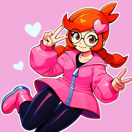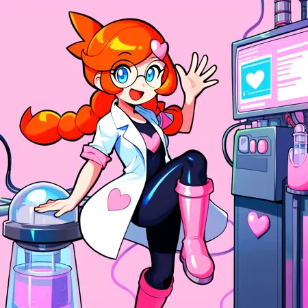 glasses, pink hairpin, labcoat, short sleeves, black bodysuit, pink boots, pink gloves