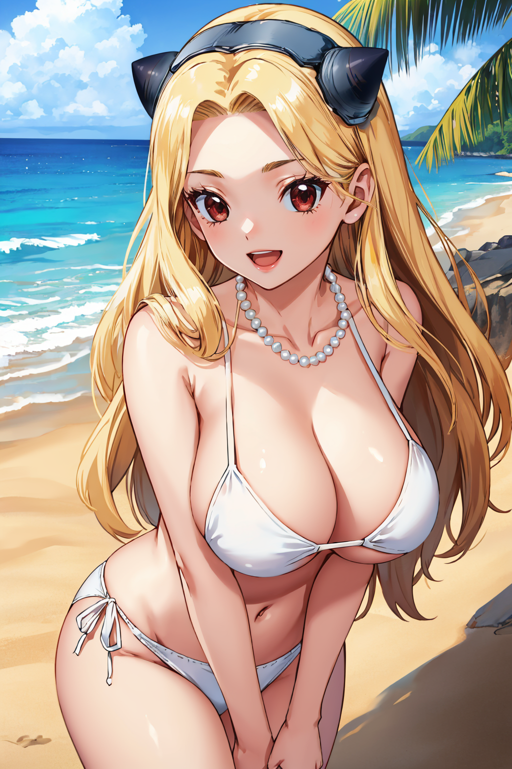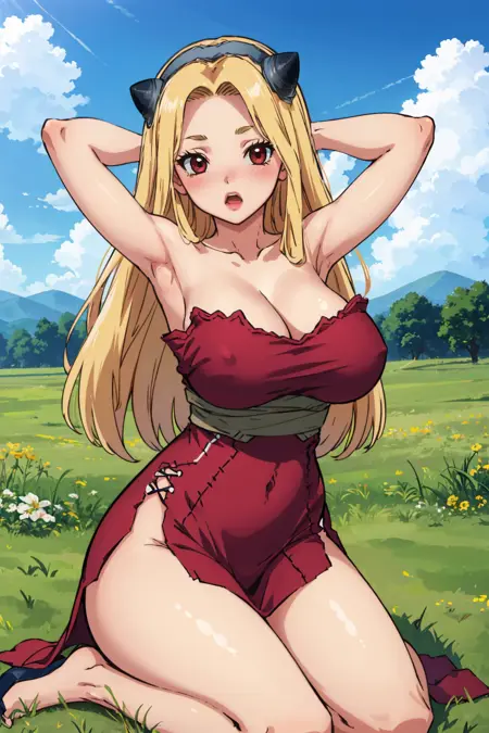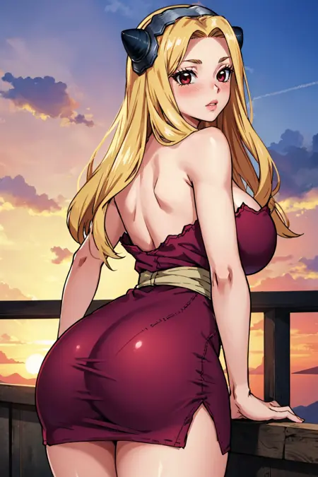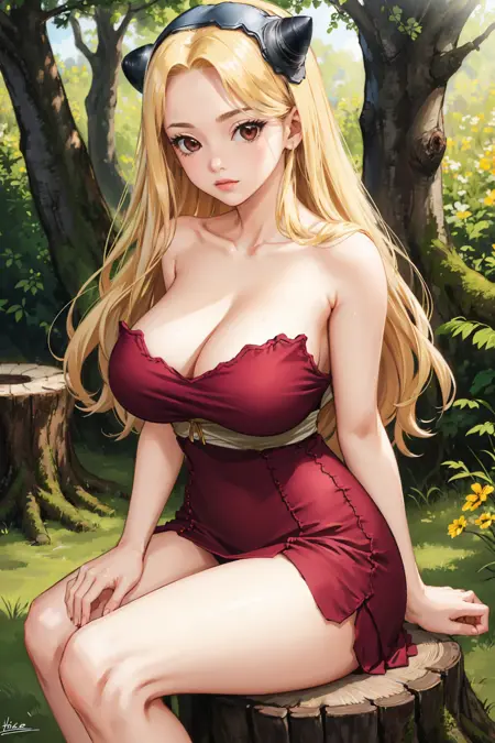 그녀의 전형적인 외모를 위해 "가짜 뿔, 헤어밴드, 노출된 어깨, 가슴선, 보라색 드레스, 언더버스트, 스트랩리스"를 추가하세요.