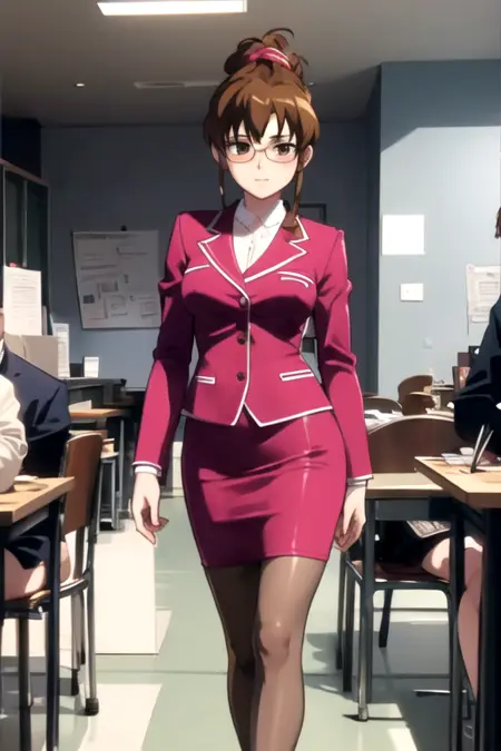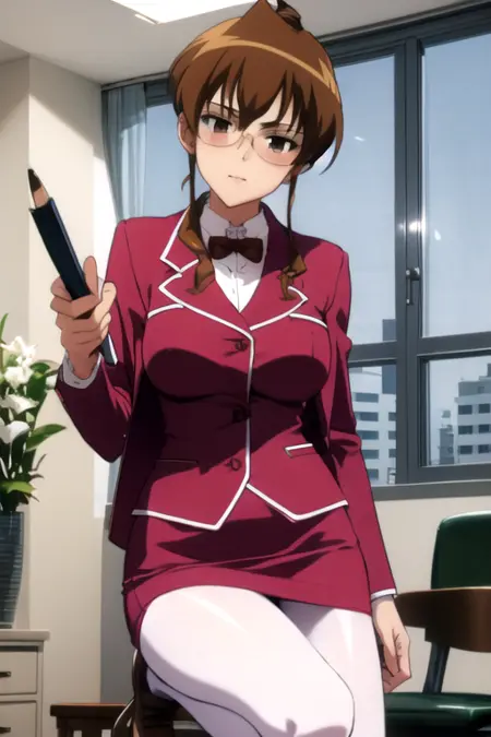 SaoriShikijou, 1girl, solo, skirt, brown hair, brown eyes, jacket, pantyhose, shoes, glasses, miniskirt, formal, suit, pencil skirt, skirt suit