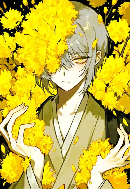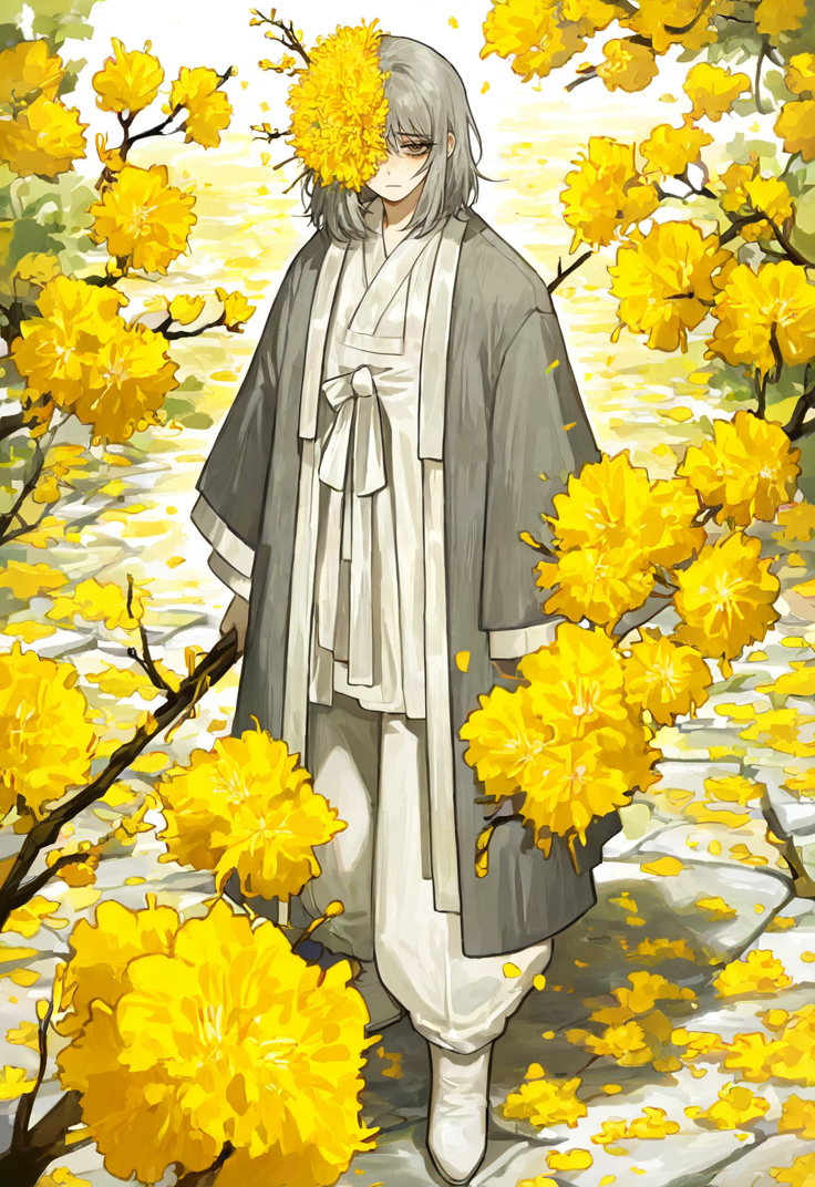 DongbaekEGO、片目に花、黄色い花、黄色いツバキの花、茶色の目、中程度の髪、灰色の髪、和風の衣装、白いローブ、白いズボン、白いブーツ、グレーのコート、開いたコート、広い袖、ブランチを持っている