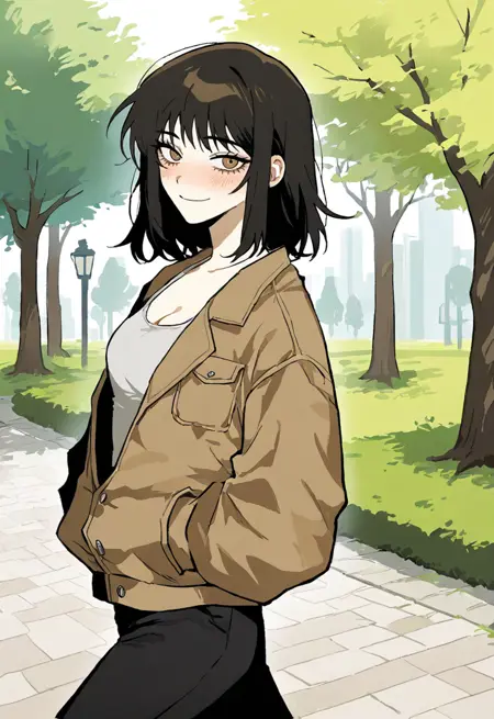 DongbaekYoung、茶色の目、中程度の髪、黒髪、白いタンクトップ、グレーのシャツ、茶色のジャケット、黒いズボン、茶色のブーツ