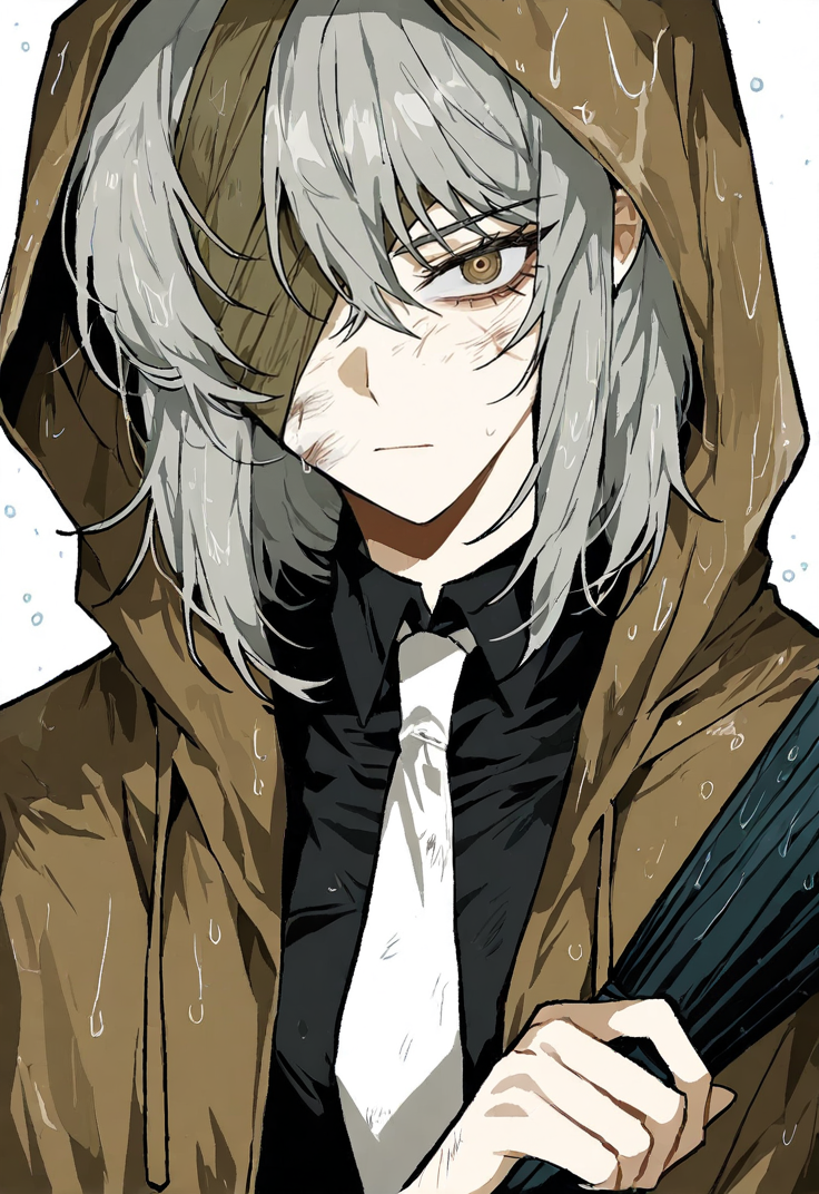 DongbaekOld、片目にはサポーター、茶色の目、中程度の髪、灰色の髪、黒いシャツ、白いネクタイ、グレーのズボン、茶色のブーツ、濃い茶色のレインコート、フード、フードをかぶっている、傘を持っている