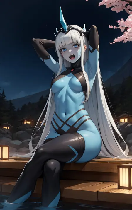 1girl, 001_(darling_in_the_franxx), 蓝色眼睛, 蓝色皮肤, 王冠, 发饰, 姬发式, 长发, 单角, 直发, 白发, 齐刘海, 彩色皮肤, 蓝色角, 小乳房, 尾巴, 锁骨, 蓝色指甲, 极长发, 刘海, 龙尾, 尖牙, 指甲油, 侧发,