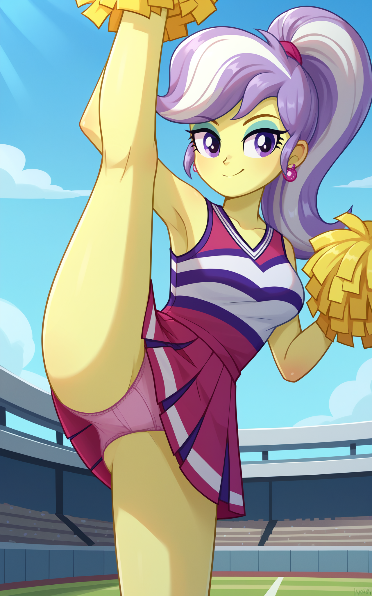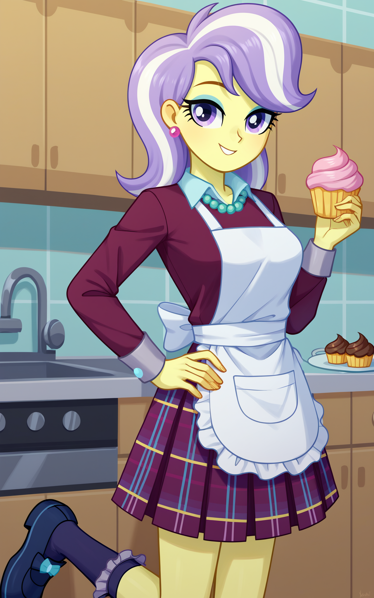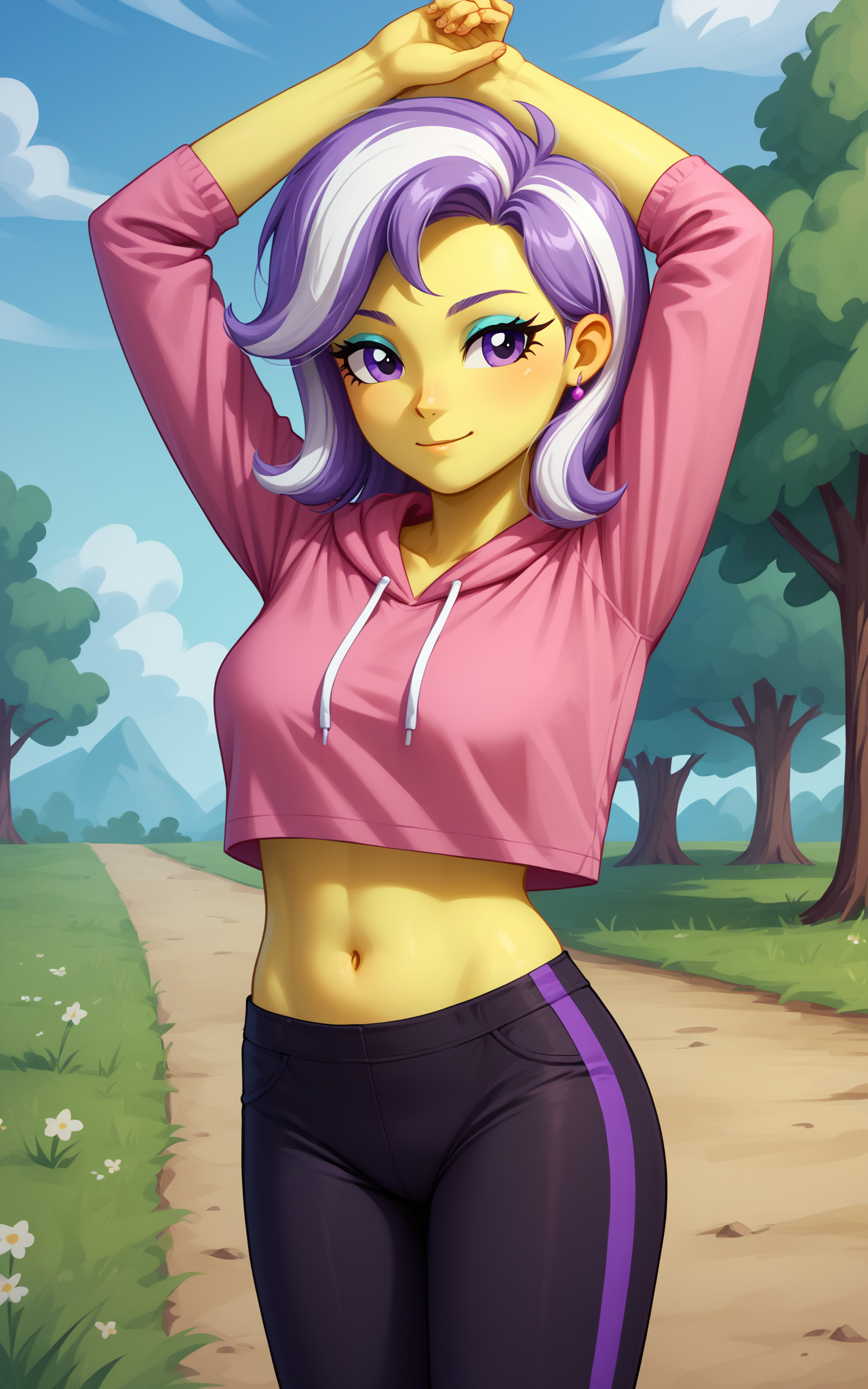 トリガー:UpperCrust, Equestria Girls, 色付きの肌, 黄色の肌, 紫の目, 長い髪, 多色の髪, 二色の髪, 紫の髪, 白い髪, クリスタル予備校の制服, ジュエリー, ピアス, ネックレス, アイシャドウ