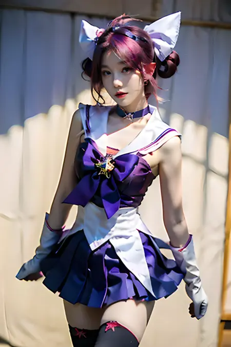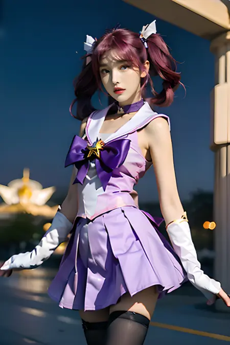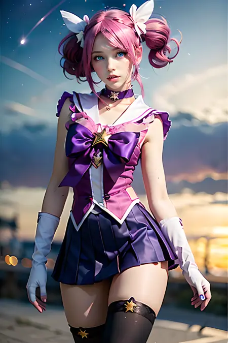 关键词:发饰、粉发、双马尾、魔法少女、项圈、白色肘套、水手领、蝴蝶结、备用服装、紫色百褶裙、星星(符号)、白色/黑色过膝袜