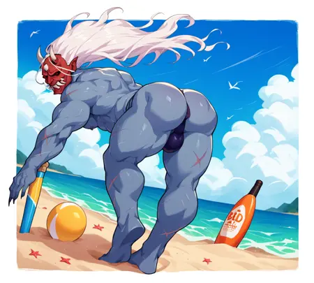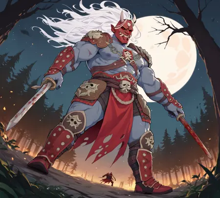 TheOniDBD, Dead By Daylight, oni, demon, humanoid, red mask, long white hair, grey body, male, muscular, barazoku