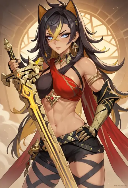 - 对于基础服饰和装备,可使用:交叉式吊带、手套、露颈吊带、不对称服装、裤子、红色指甲、盔甲、剑