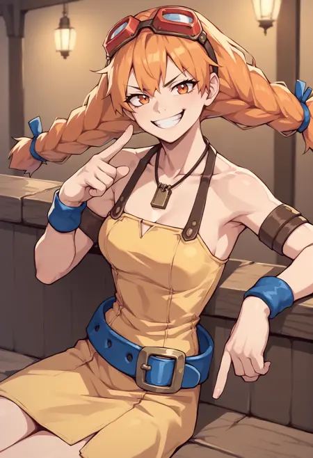 显著标签:双马尾、橙色头发、长发、橙色眼睛、项链、裙带、黄色连衣裙、护目镜戴在头上、臂环、蓝色腰带、腕带、单只手套、黄色靴子