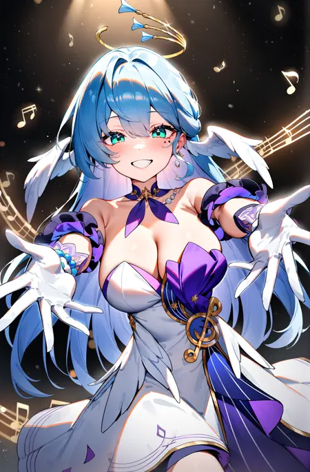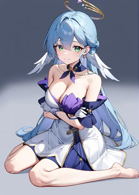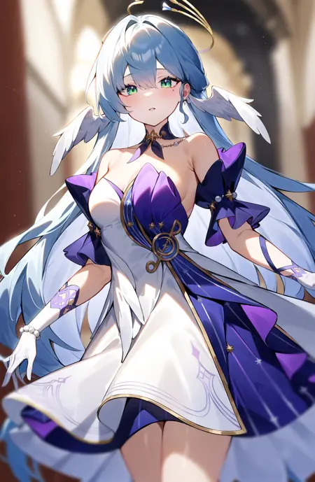 prompt: robin, white_gloves, halo, head wings, strapless, strapless_dress, green_eyes, bare_shoulders, jewelry, detached_sleeves, hight_heels