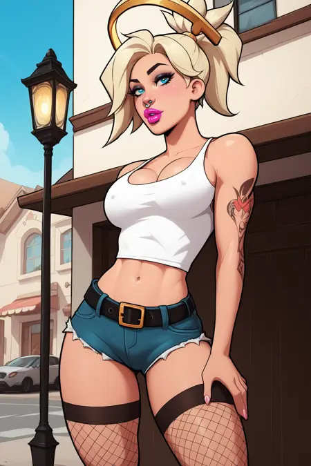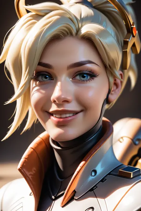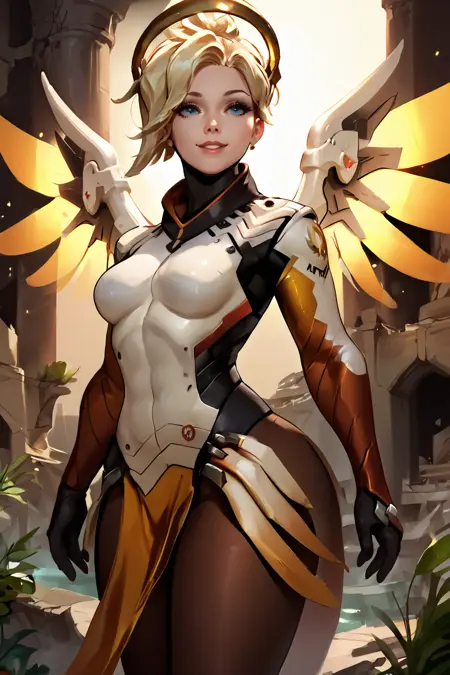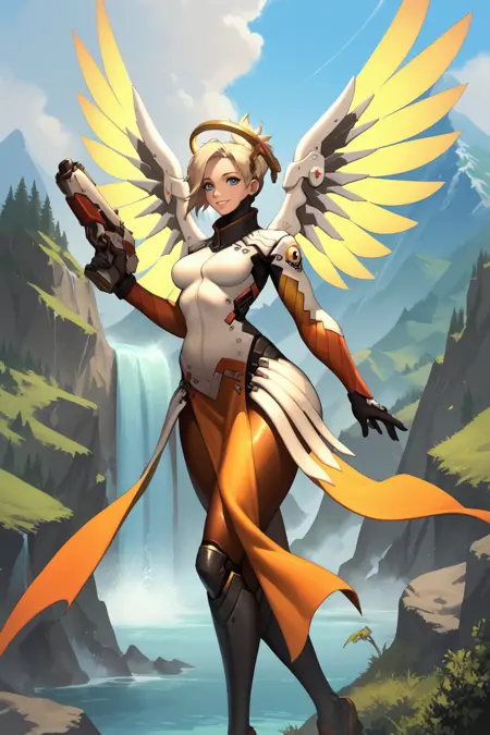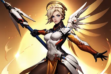 Mercy from Overwatch. I know Pony knows her well. It was a request. Used no trigger from Pony to create her so its my Version. Wings are on/off able. Lora is a little strong, espacially with style loras. But like coffe, better to strong then to weak. If that is an issue tell me. But the Wings and staff would show up more often without asking ;)