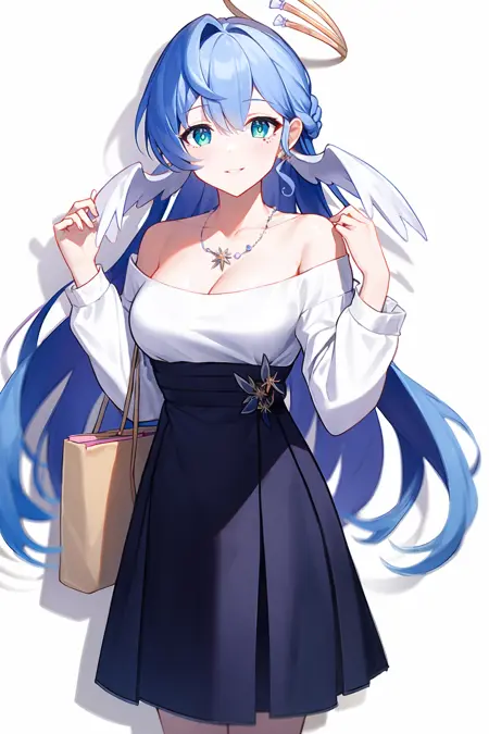 タグ:1girl,solo,halo,long hair,blue hair,hair ornament,earrings,mole,blue eyes,jewelry,white gloves,bare shoulders, white dress, strapless dress,head wings,