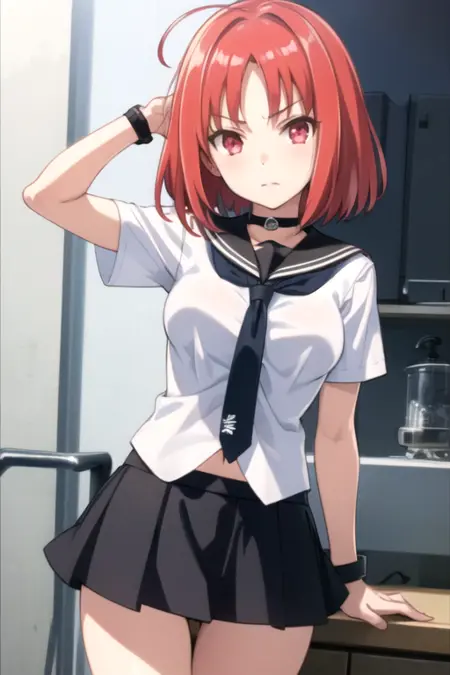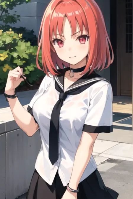 AkaneMishima, 1girl, solo, short hair, black skirt, red eyes, red hair, serafuku, choker, pink eyes, medium breasts, white shirt, short sleeves, pleated skirt, necktie, miniskirt, wristbands