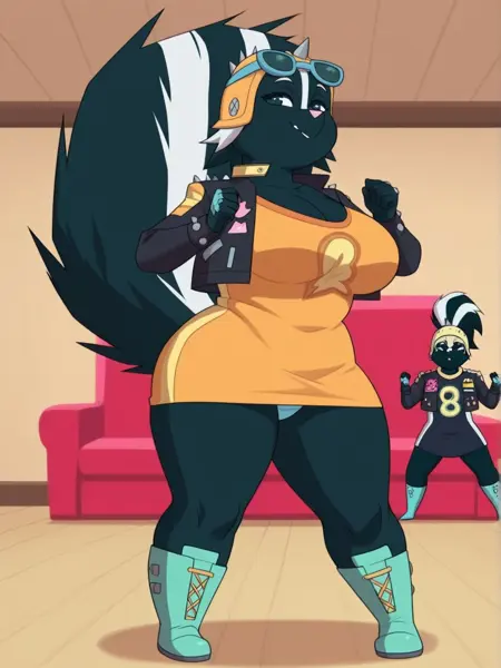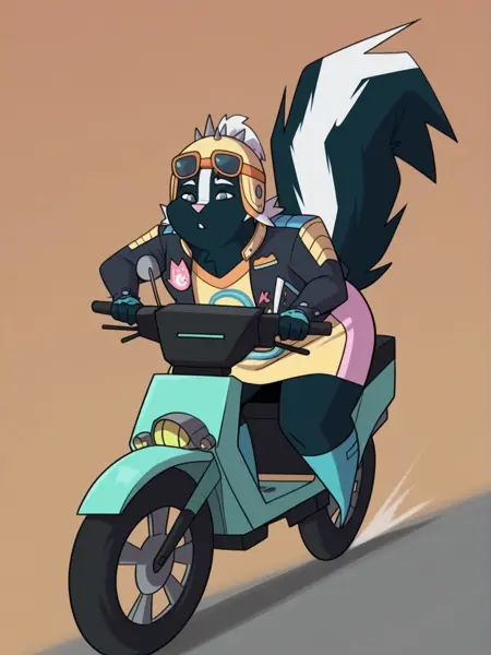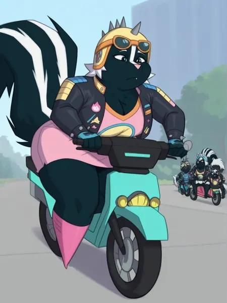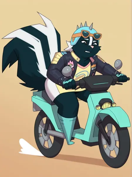 키포와 마법동물 시대의 캐릭터들, 자신의 "신체 가스"를 이용하여 스쿠터를 타는 조용한 스컹크 소녀들. 이건 정말로 친환경적인 이동 수단이죠(비록 냄새가 심하지만요).