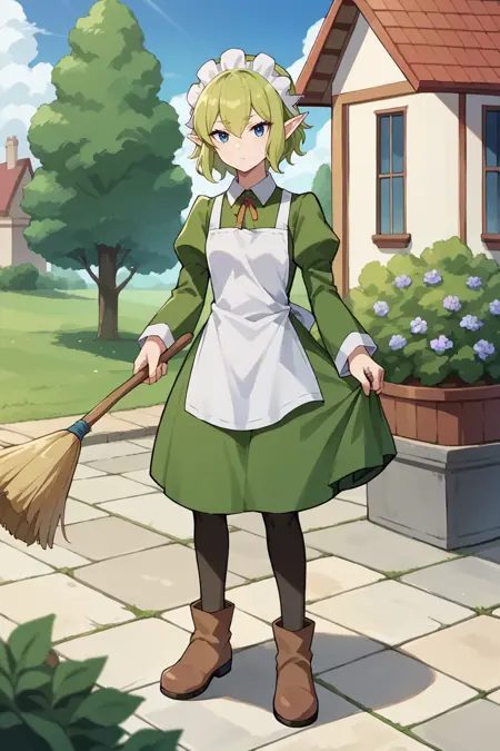 Add "maid headdress, green dress, long sleeves, white apron, pantyhose, boots" for her maid outfit.