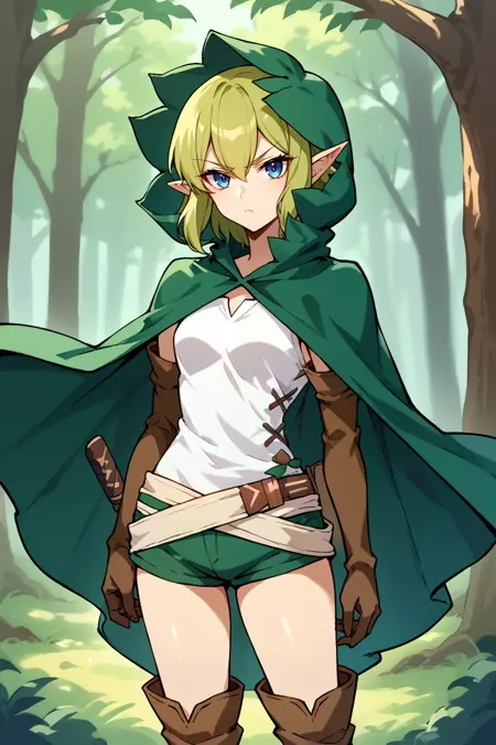 Add "hood, green cloak, white shirt, sleeveless, belt, green panties, elbow gloves, thigh boots" for her cloak. ("Green shorts" can also be used.)