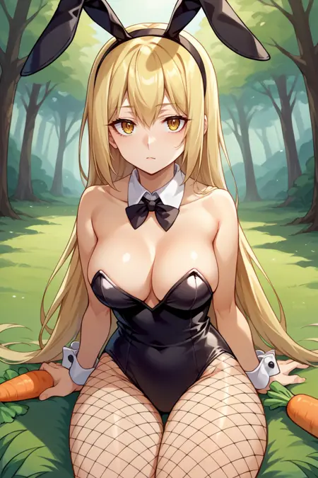• Add "playboy bunny, fake rabbit ears, detached collar, black leotard, fishnet pantyhose, wrist cuffs" for her bunny suit.