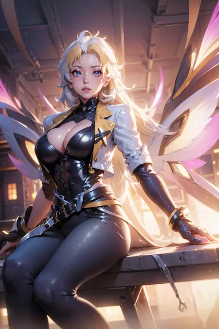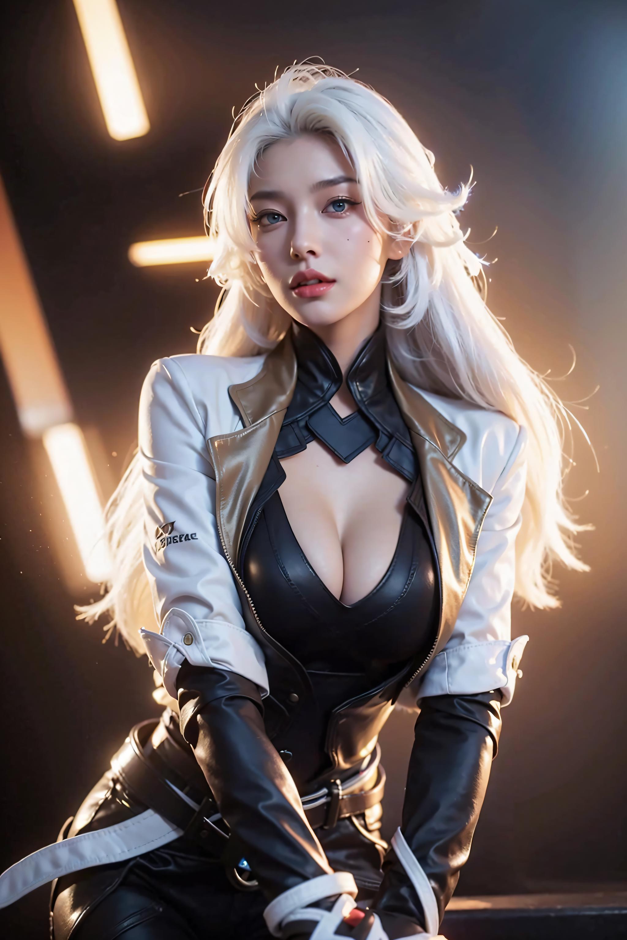 Lauriel Aov, 1girl, solo, long hair, blonde hair, white hair, alternate hair color, multicolored hair, bangs, shiny, shiny hair, blue eyes, mole, mole under eye, lips, cleavage, cleavage cutout, breasts, large breasts, jacket, white jacket, cropped jacket, clothing cutout, open clothes, open jacket, bodysuit, gloves, fingerless gloves, black gloves, belt, pants, black pants, shoes, white footwear, alternate costume