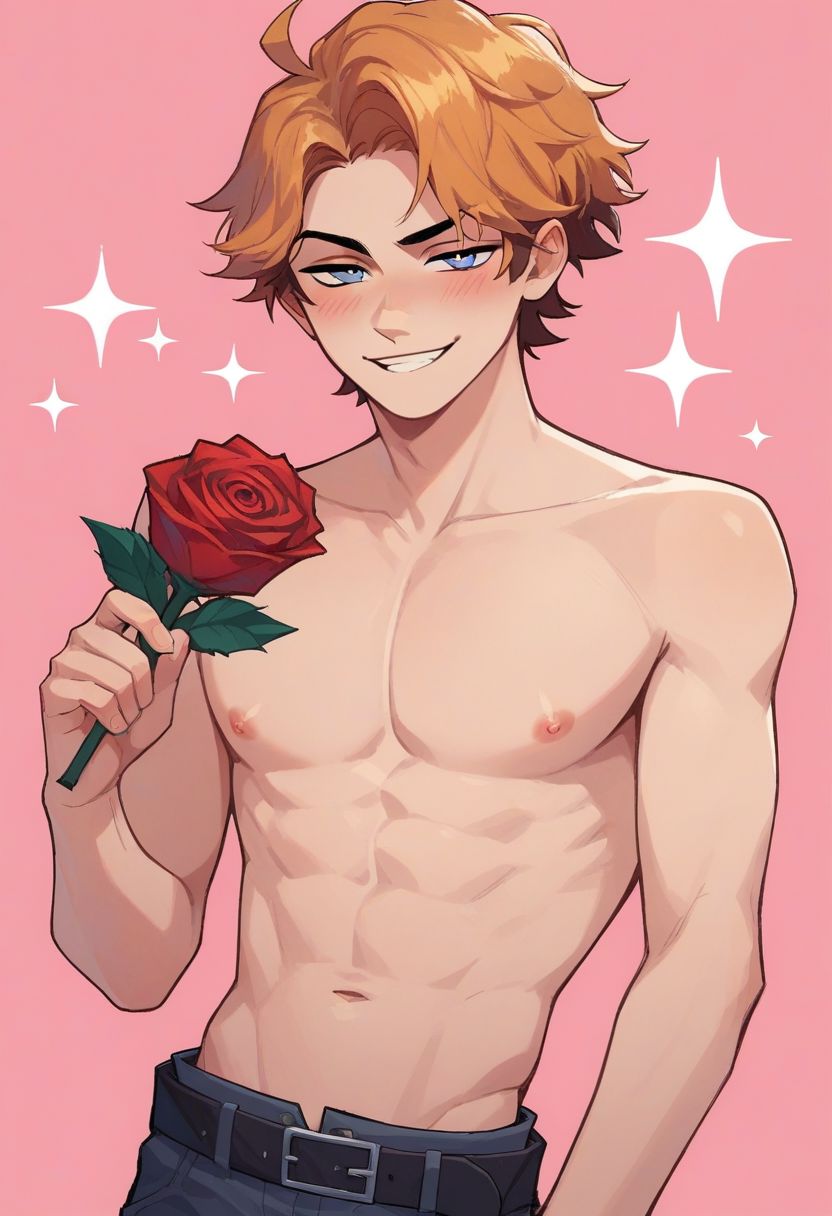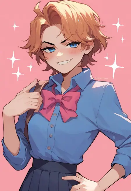 Senpai, orange hair, blue eyes, blue shirt, loose pink tie, dark gray jeans, black belt, dark gray shoes