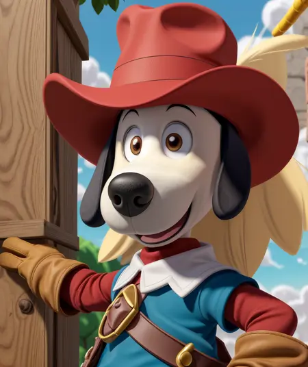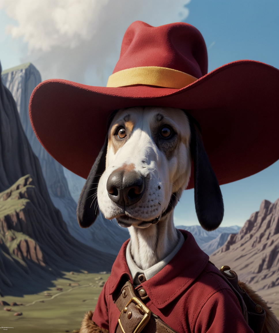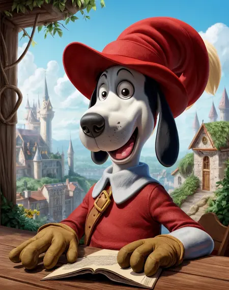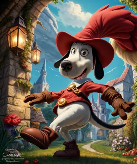ethereal fantasy concept art of , cartoon, lora:quiron\_Dogtanian\_v3\_Lora:0.77 dogtanianquiron, dogtanian, 1boy, gloves, red hat, magical, fantastical, enchanting, storybook style, . magnificent, celestial, ethereal, painterly, epic, majestic, magical, fantasy art, cover art, dreamy