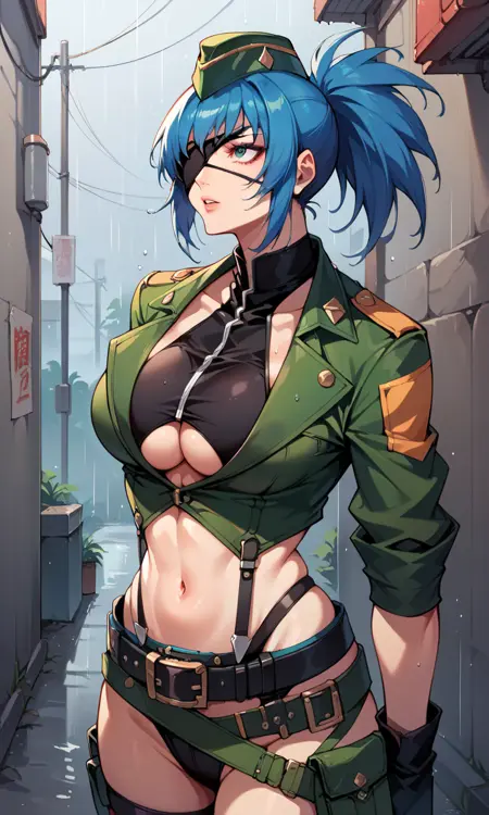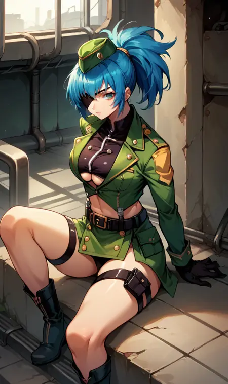 她的SNK Heroines中Heidern风格装:“HeidernLeona,绿色夹克,下胸露,军帽,眼罩,大腿绑带”。