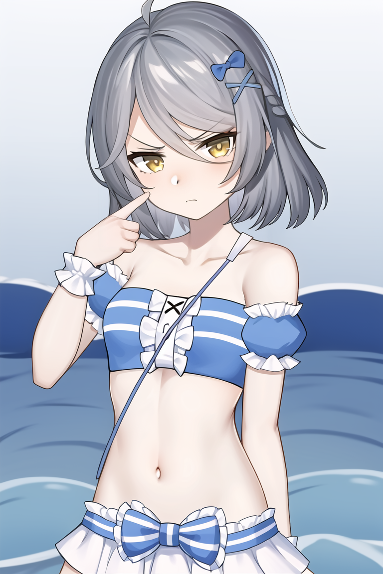 ankaxiya,skin05,1girl,solo,swimsuit,short hair,navel,bikini,bare shoulders,hair ornament,yellow eyes,stomach,grey hair,thigh strap,collarbone,frills,thighs,miniskirt,strapless,skirt,x hair ornament,bangs,bow,blue bikini,small breasts,hairclip,ahoge,