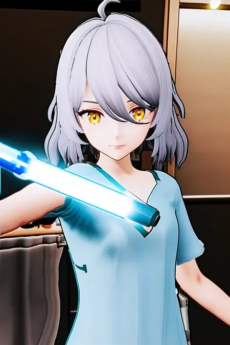 ankaxiya,skin02,1girl,solo,long hair,grey hair,gloves,bangs,bodysuit,yellow eyes,long sleeves,black gloves,small breasts,ahoge,hair ornament,hairband,