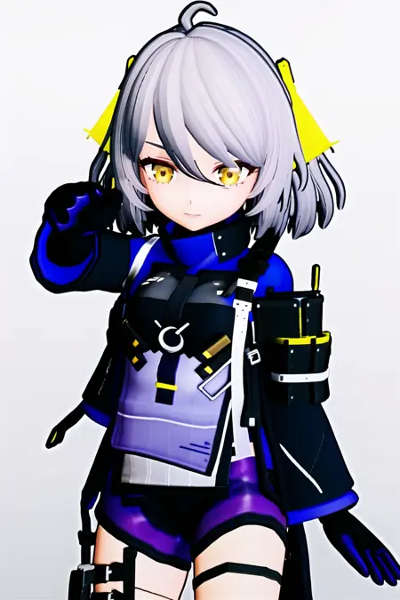 ankaxiya,skin00,1girl,solo,gloves,grey hair,bangs,short shorts,black gloves,breasts,yellow eyes,jacket,black shorts,hair between eyes,short hair,ahoge,long sleeves,purple gloves,