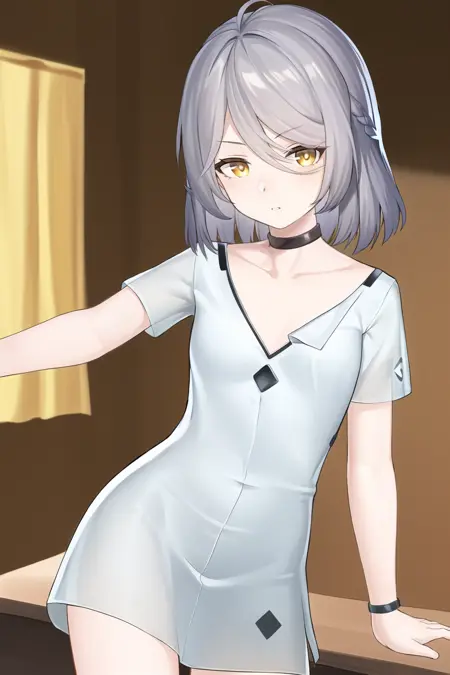 ankaxiya,skin01,1girl,solo,yellow eyes,black choker,grey hair,collarbone,braid,short sleeves,bangs,small breasts,dress,