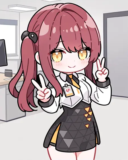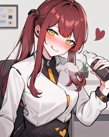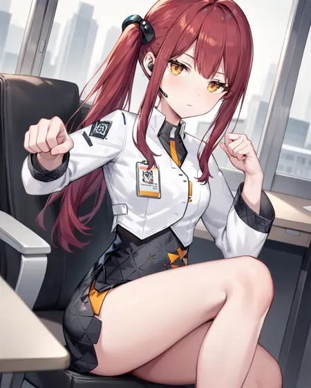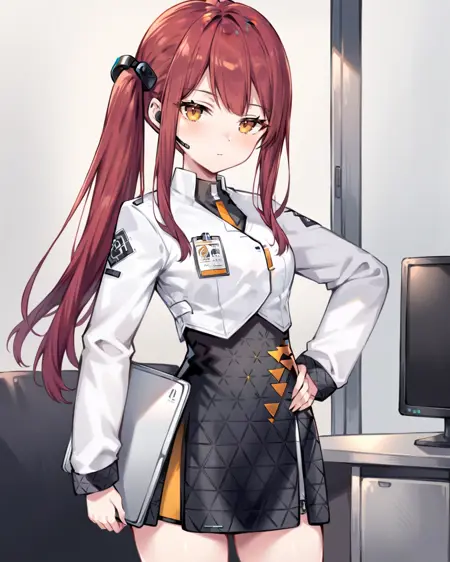 skirt,long hair,black skirt,long sleeves,shirt,white jacket,yellow eyes,side ponytail,white shirt,red hair,earpiece,bow,hair bow,high-waist skirt,bangs,headset,jacket,collared shirt,sidelocks,miniskirt,
