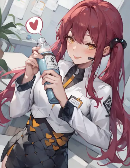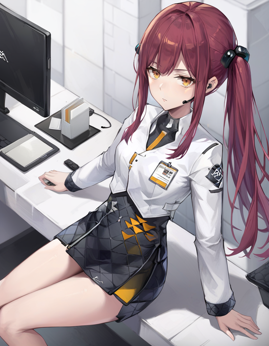 skirt,long hair,black skirt,long sleeves,shirt,white jacket,yellow eyes,side ponytail,white shirt,red hair,earpiece,bow,hair bow,high-waist skirt,bangs,headset,jacket,collared shirt,sidelocks,miniskirt,