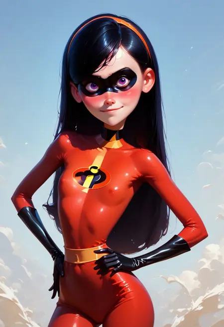 Prompt activator : 1girl, violetparr (/The Incredibles)/,(ultra HD quality details), black hair, long hair, hairband, purple eyes,