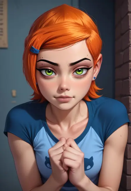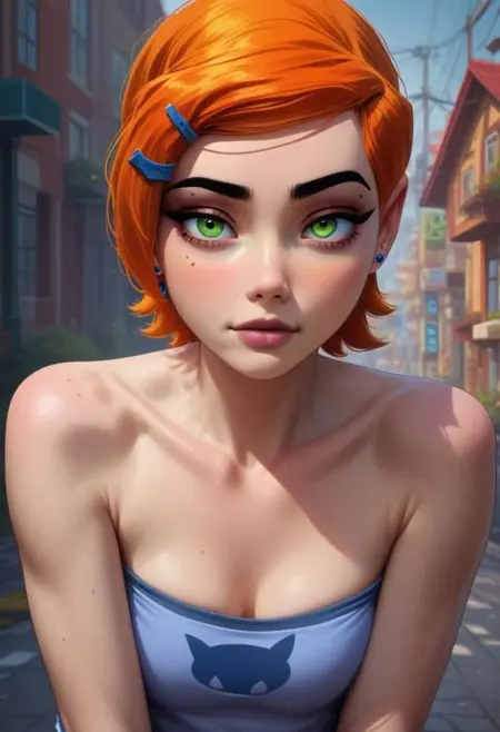 프롬프트 액티베이터: gwen tennyson (/Ben10)/,(ultra HD quality details), bright orange hair, short hair, (green eyes)