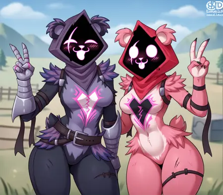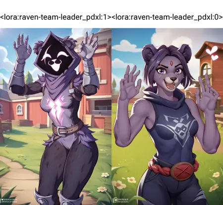 对于普通乌鸦小队队长,请使用“raven team leader”并添加相关标签(如“紫色身体”、“紫色毛发”等)。若想生成粉色皮肤,请使用“cuddly\(fortnite\)、粉色身体、粉色毛发”等。注意:普通乌鸦胸口有一个白色心形,而Cuddly乌鸦胸口是一个黑色心形。我提供了一张示例图展示这一点。90%的训练数据是经典乌鸦小队队长皮肤,因此黑色心形可能不会非常一致地出现。