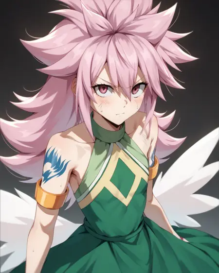 Wendy Marvell, 1girl, solo, long hair,pink eyes, pink hair,spiked hair,White wings,green dress,bare shoulders,armlet,tattoo,