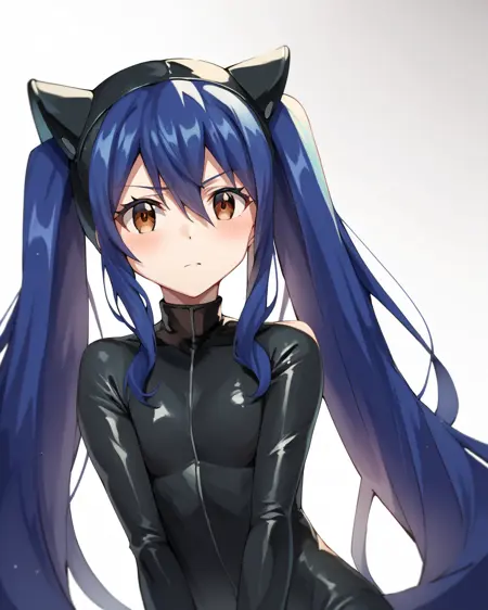 Wendy Marvell,1个女孩,单独,棕眼,双马尾,蓝发,长发,头发遮住眼睛,假动物黑耳,黑色紧身衣,